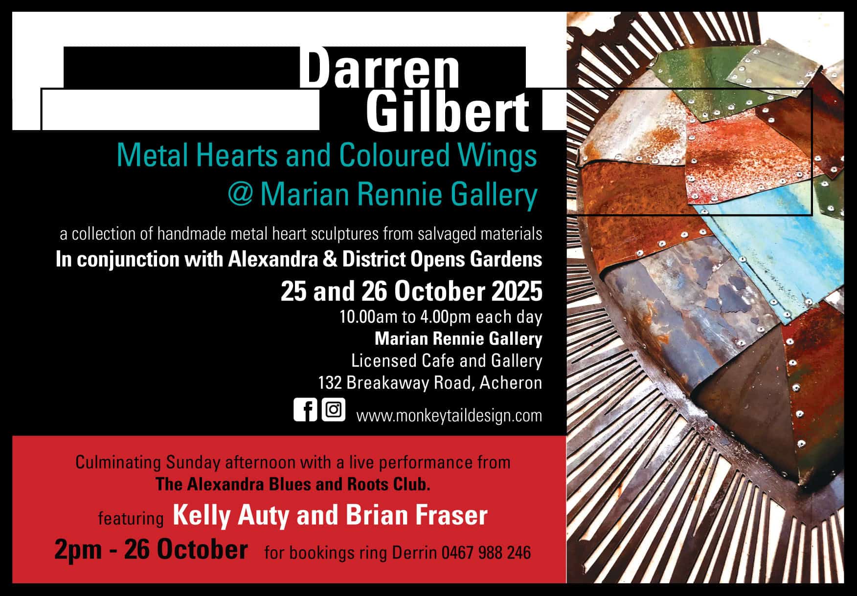 Beautiful established garden that participated in Alexandra & District Open Gardens in 2024. Marian is showcasing sculptor Darren Gilbert with sculptures for sale. Licensed café and art gallery open over the weekend.